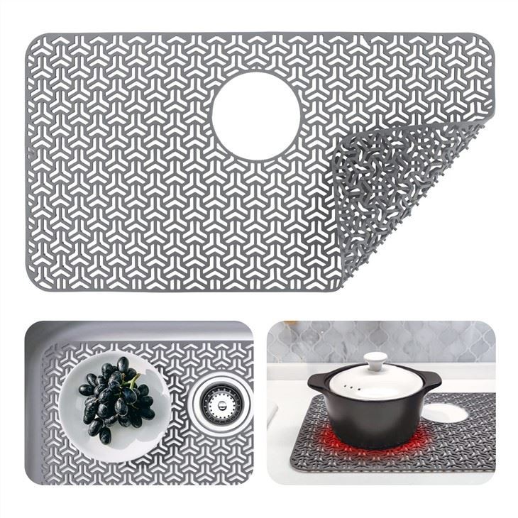 Силиконска подлога за судопер је савитљива и не хрђа. Може ефикасно спречити ломљење ломљивог посуђа ако случајно падне у судопер и избегава гребање судопера од нерђајућег челика и керамике. Силиконски штитници за судопере за судопере су издржљиви и неће рђати да би контаминирали судопер.